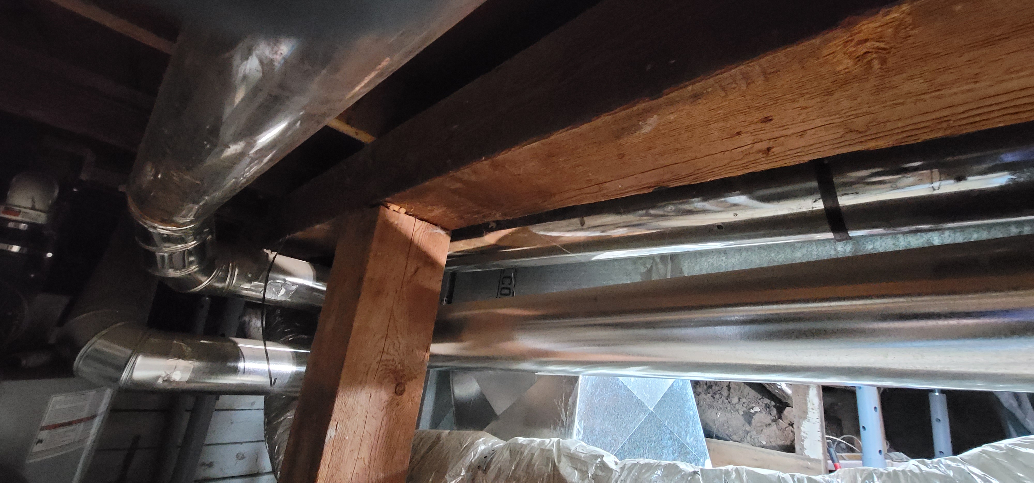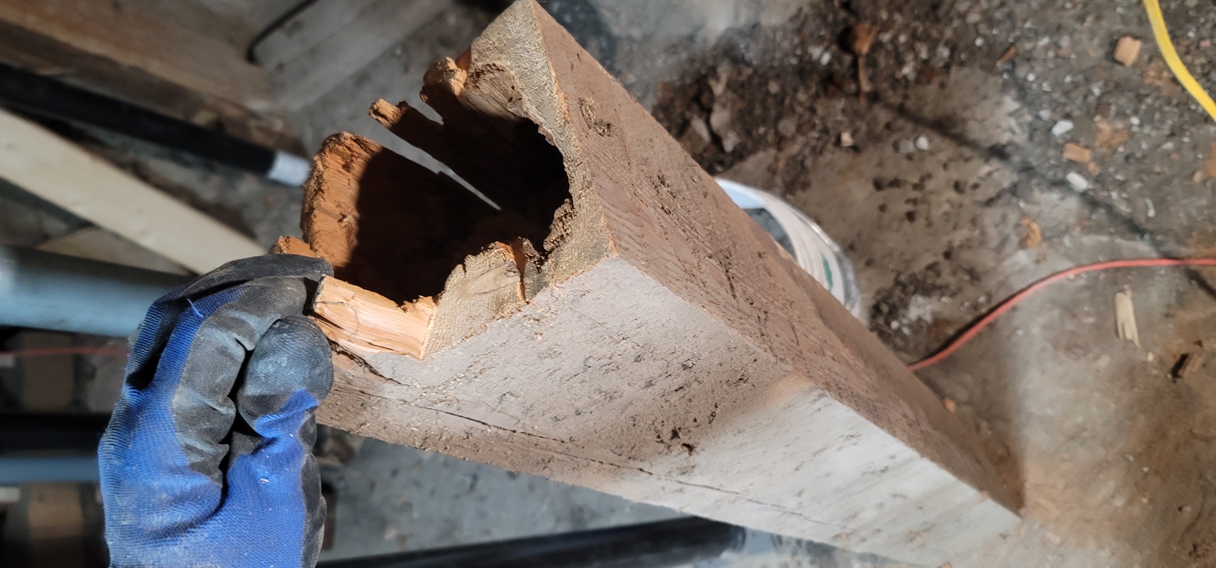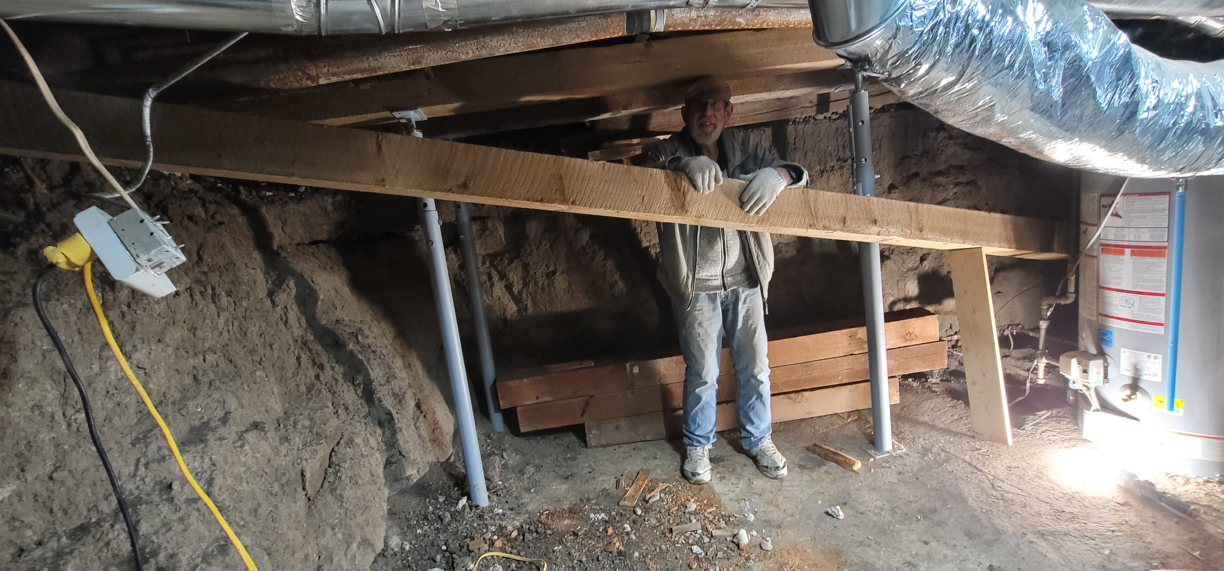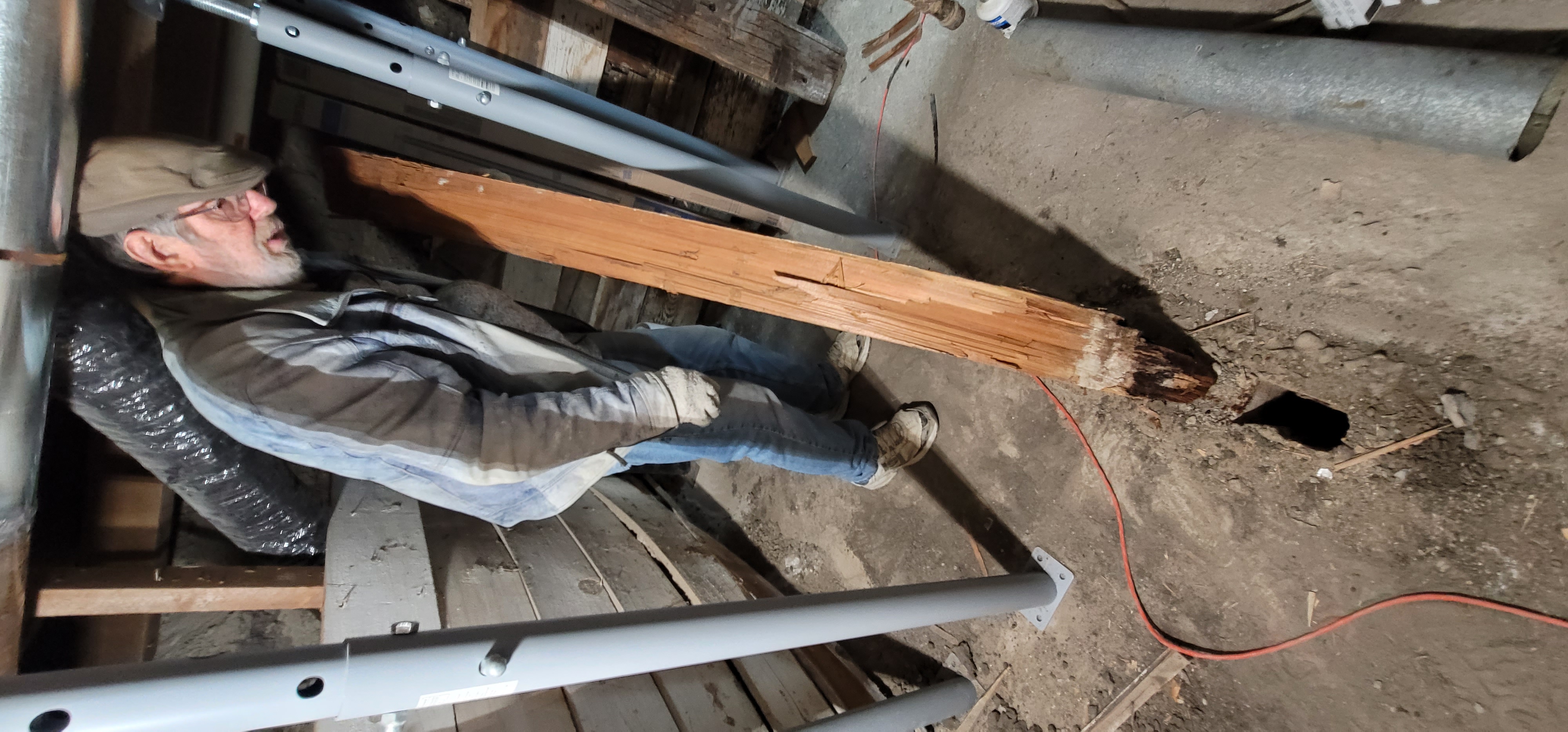 11/17/2025 4:03 PM 1978063 1403 3 Ave N Lethbridge AB prop 20251117_160347 Floyd with beam resting on 1x8 plank.jpg