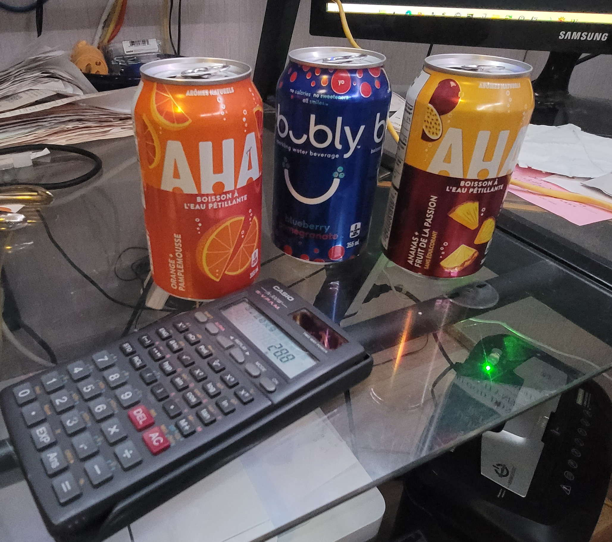 11/23/2025 10:57 PM 734453 Allan's Aha and Bubly carbonated drinks with calculator 20251123_220626.jpg
