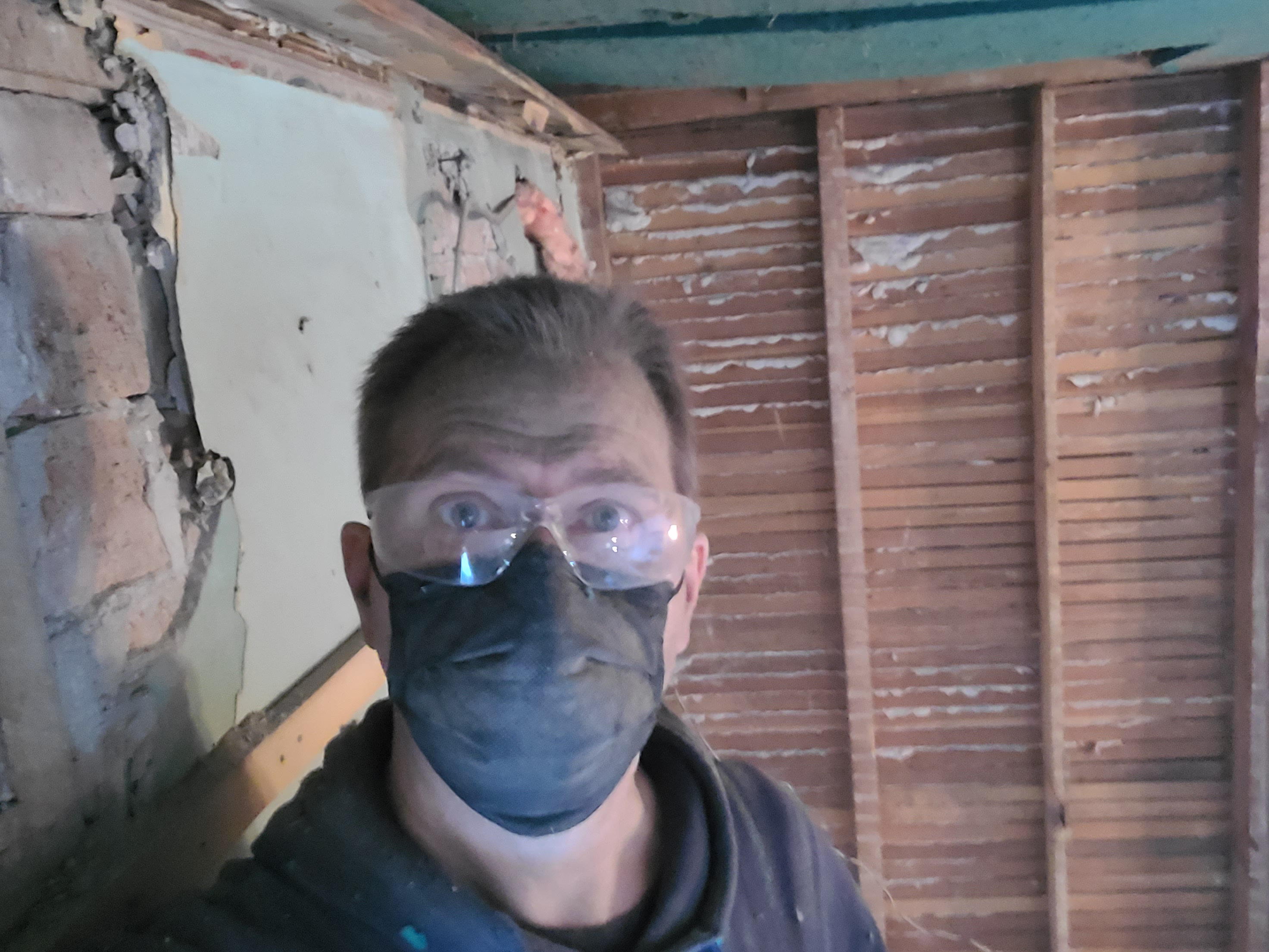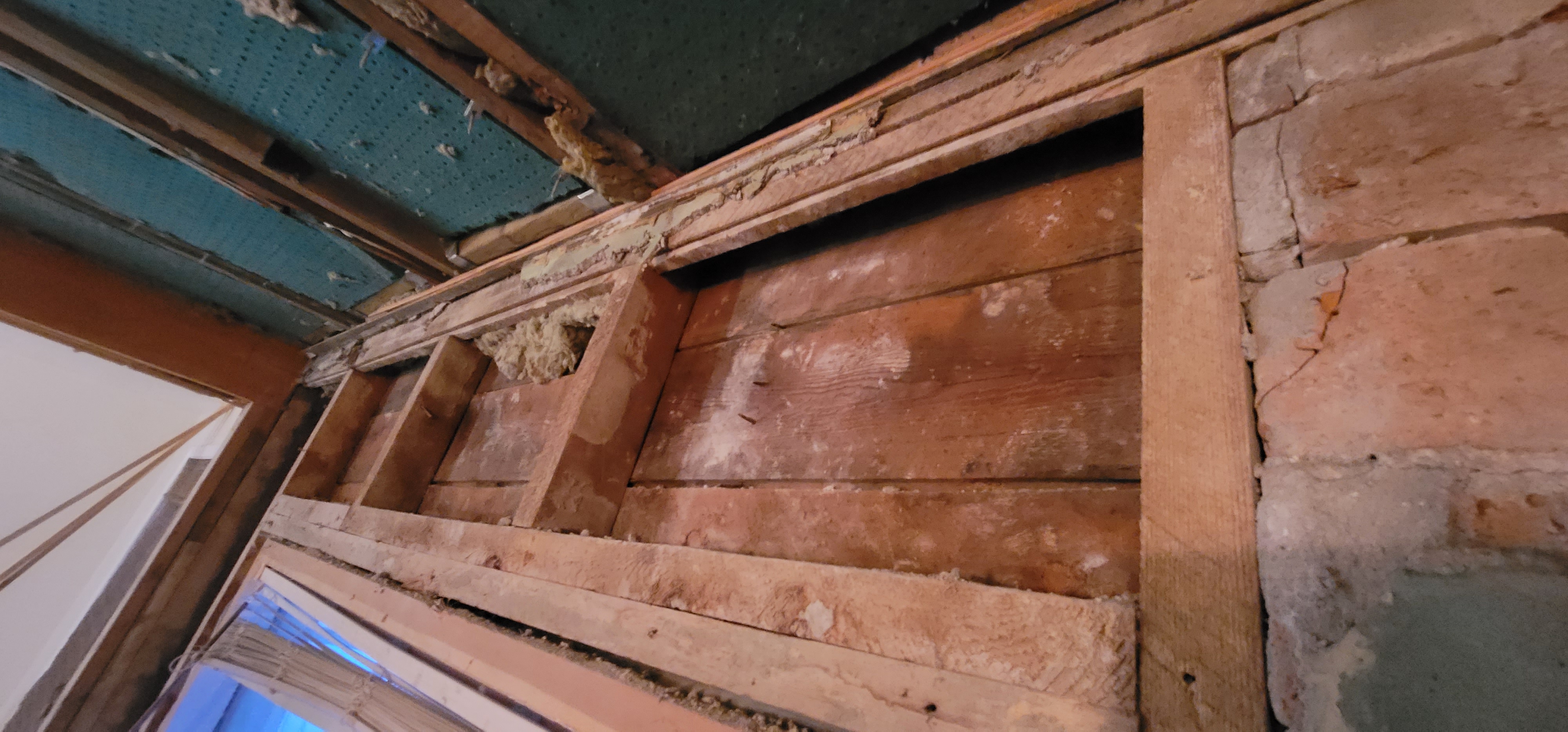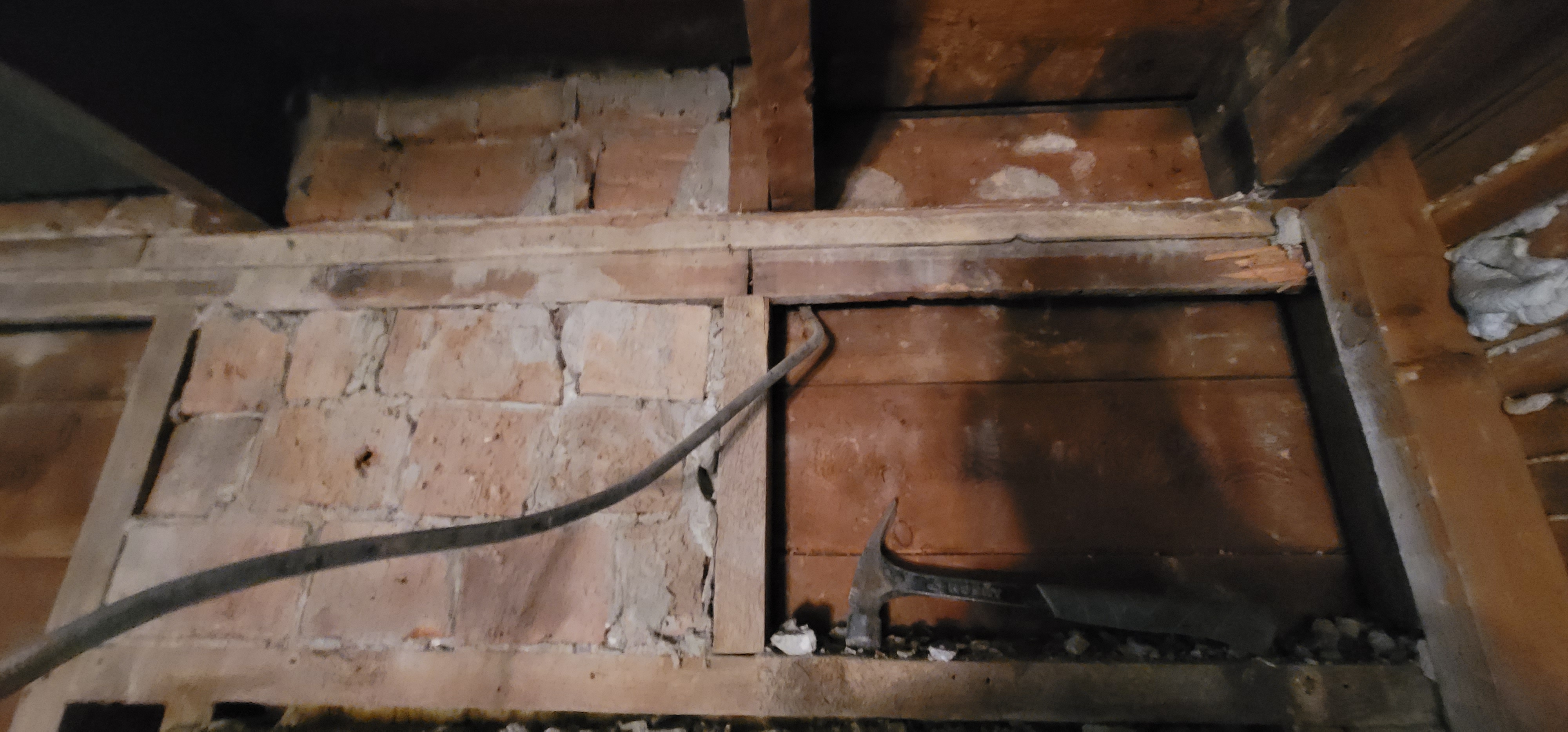 11/29/2025 5:41 PM 2124352 1403 3 Ave N Lethbridge AB main 20251129_174112 living room south wall panelling, plaster, lathe, bricks removed.jpg