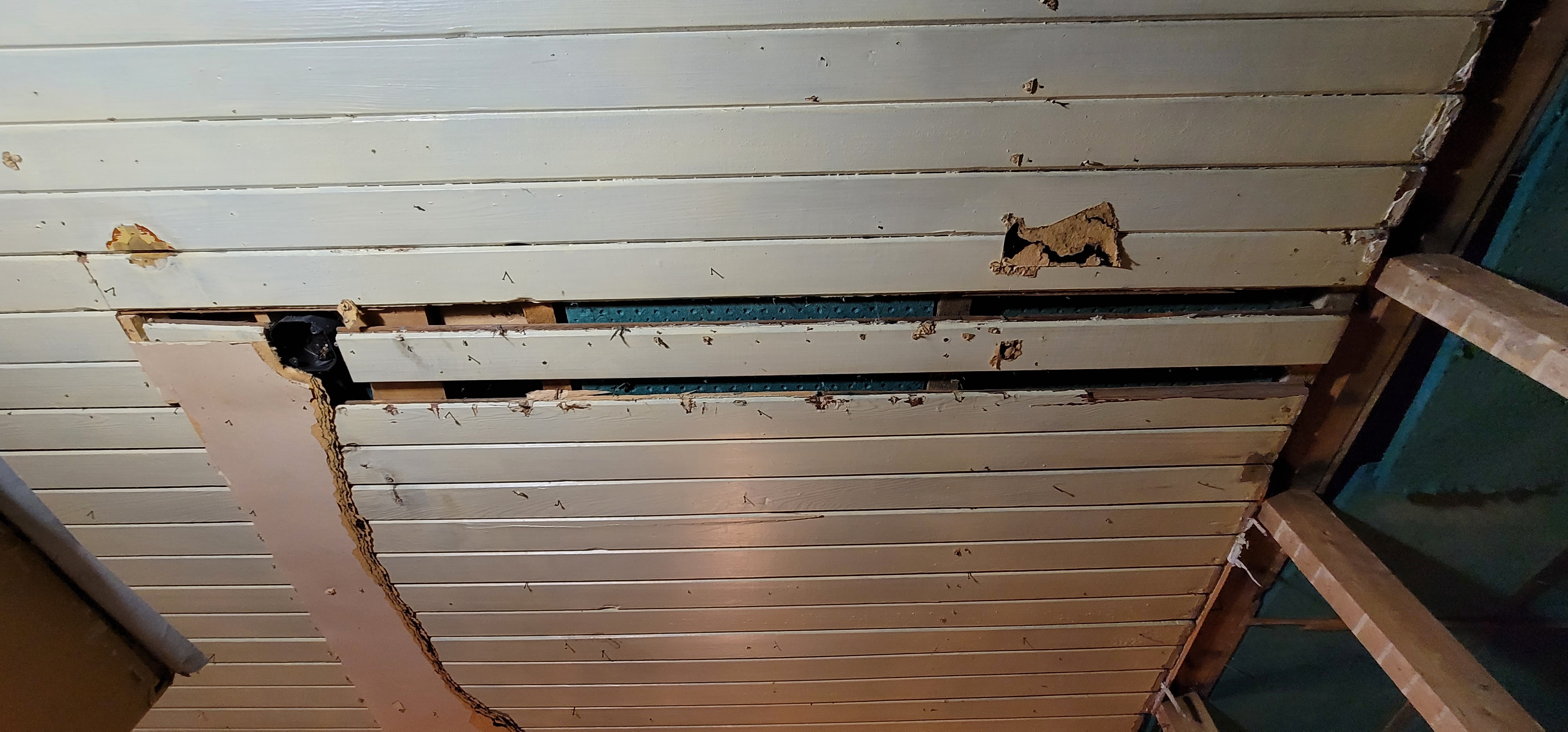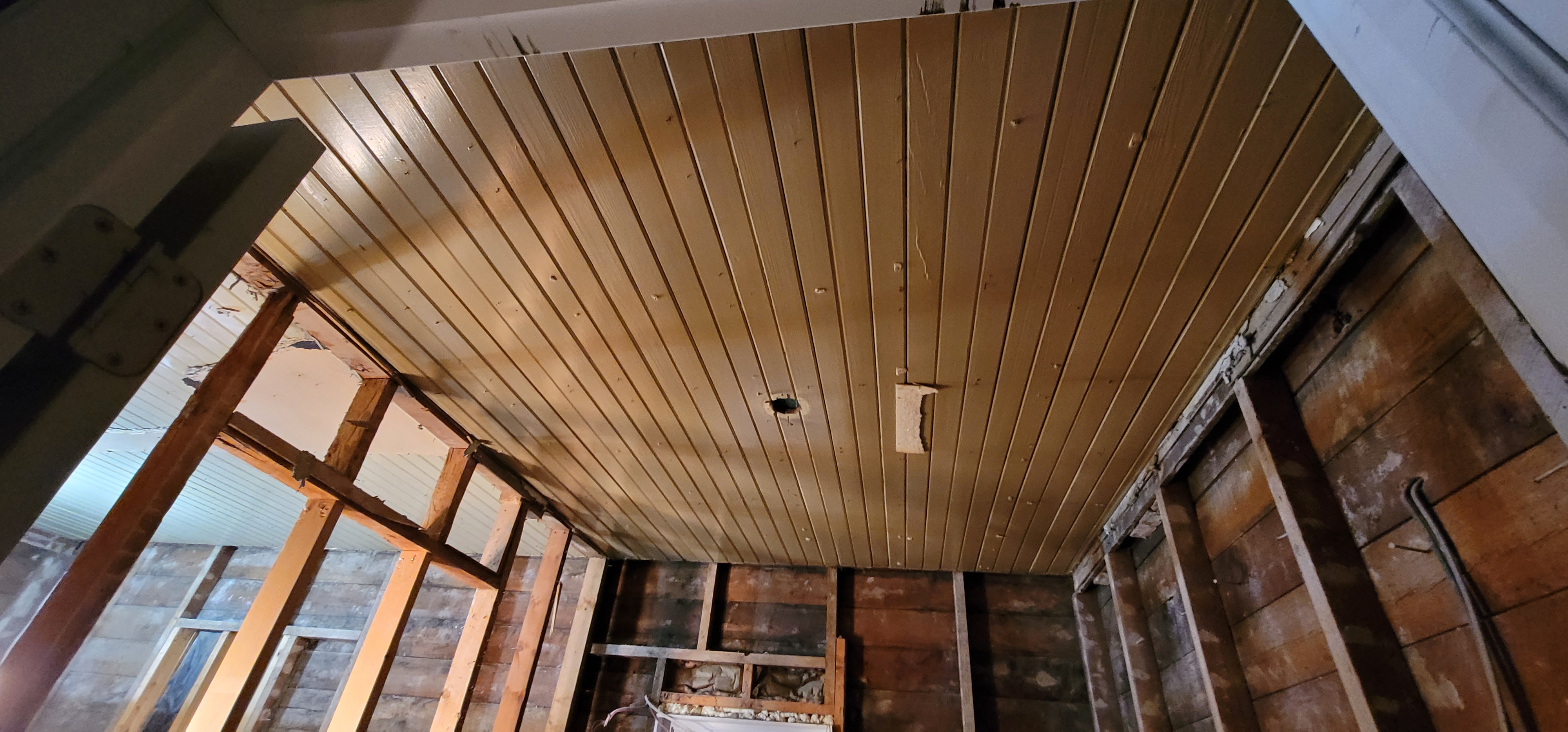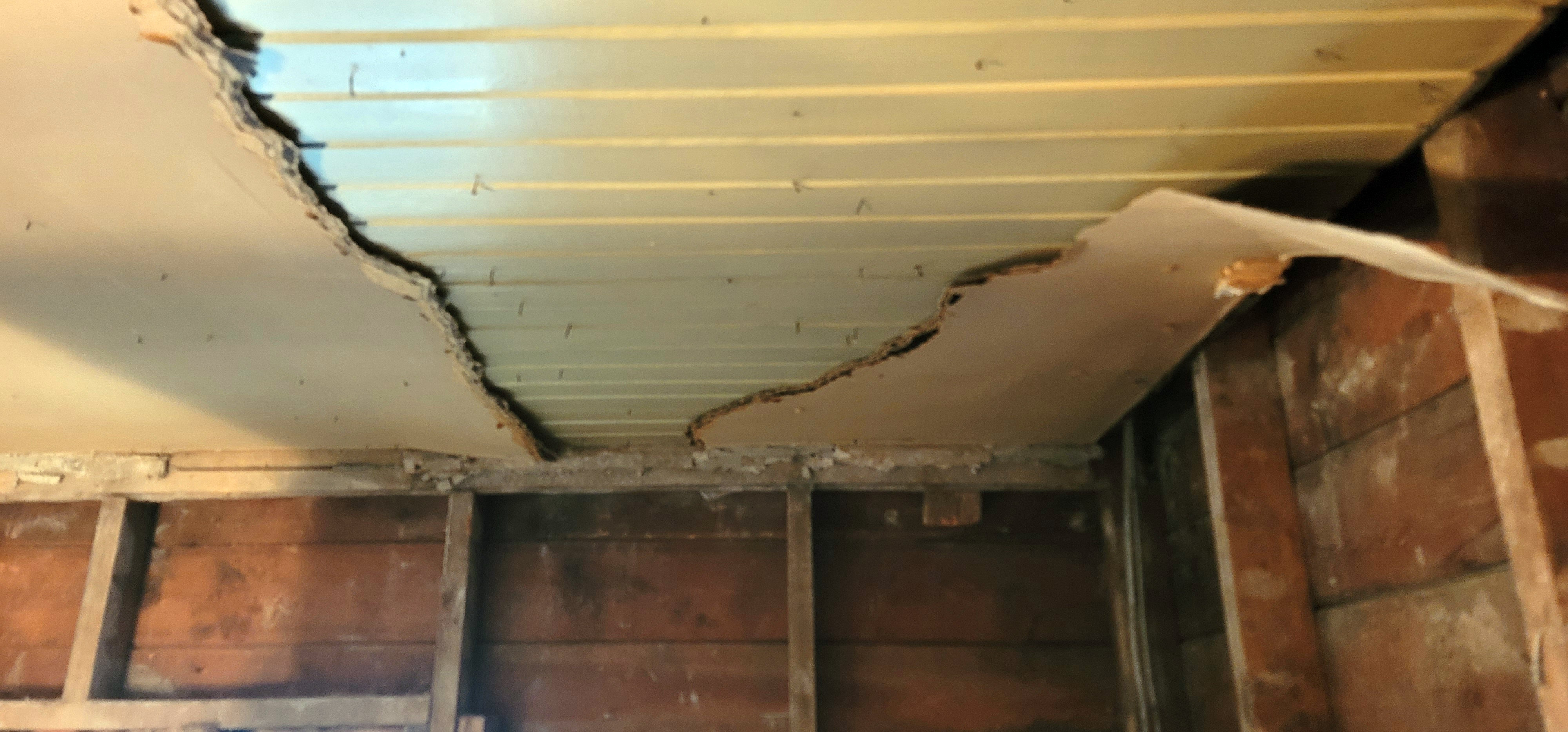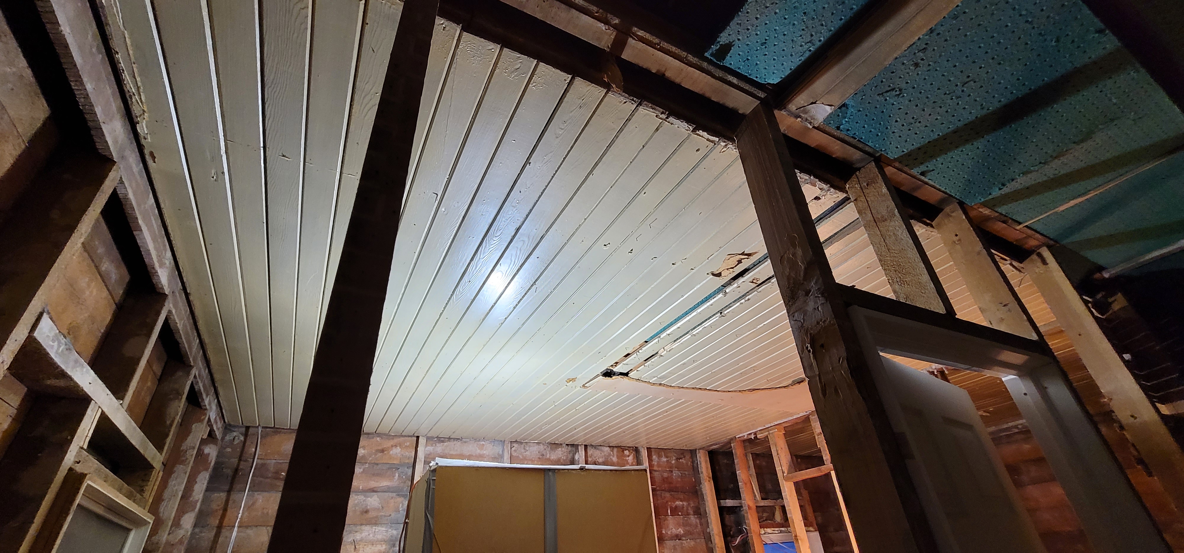12/14/2025 4:45 PM 2003285 1403 3 Ave N Lethbridge AB main 20251214_164502 damaged tongue and groove wooden ceiling exposed.jpg